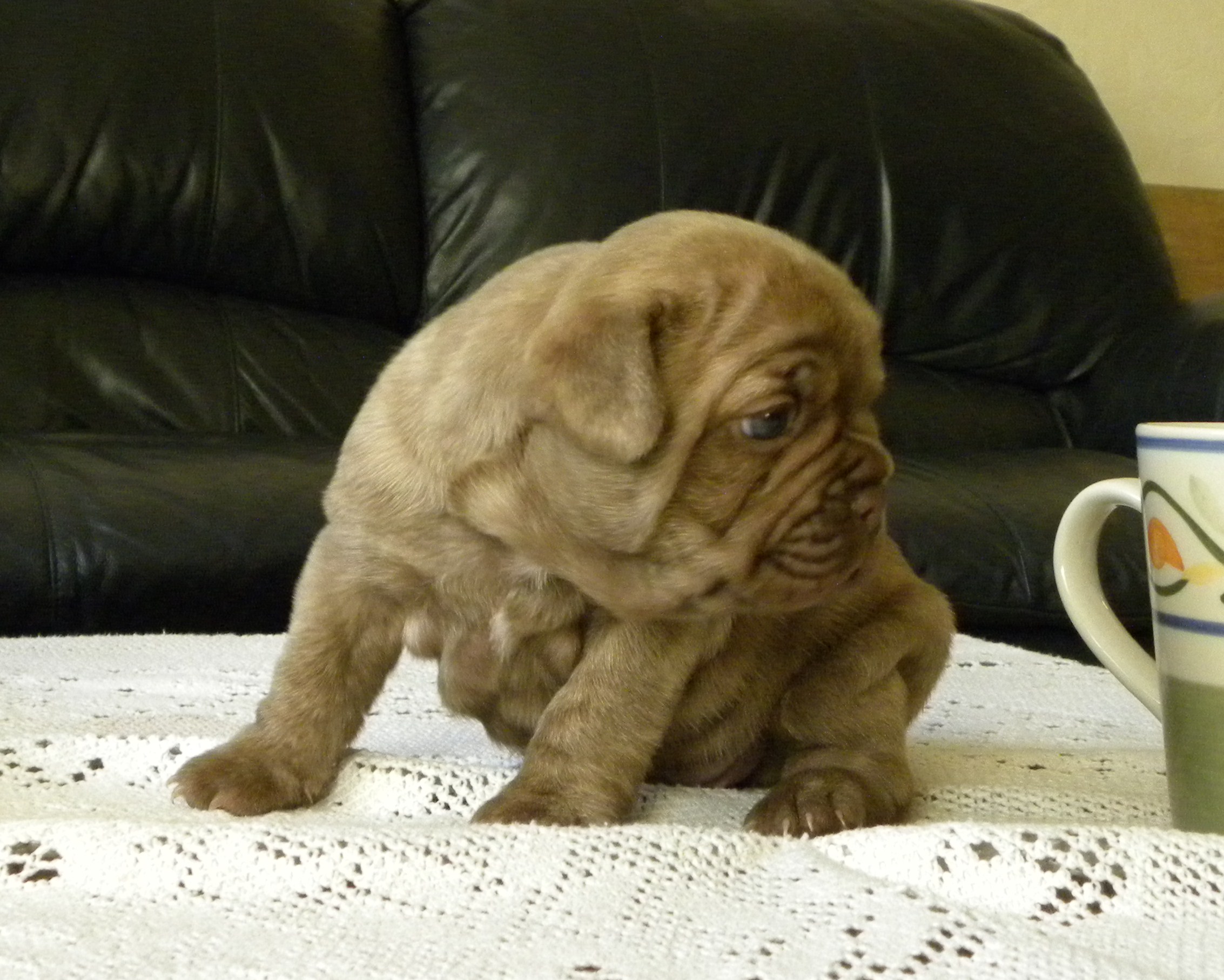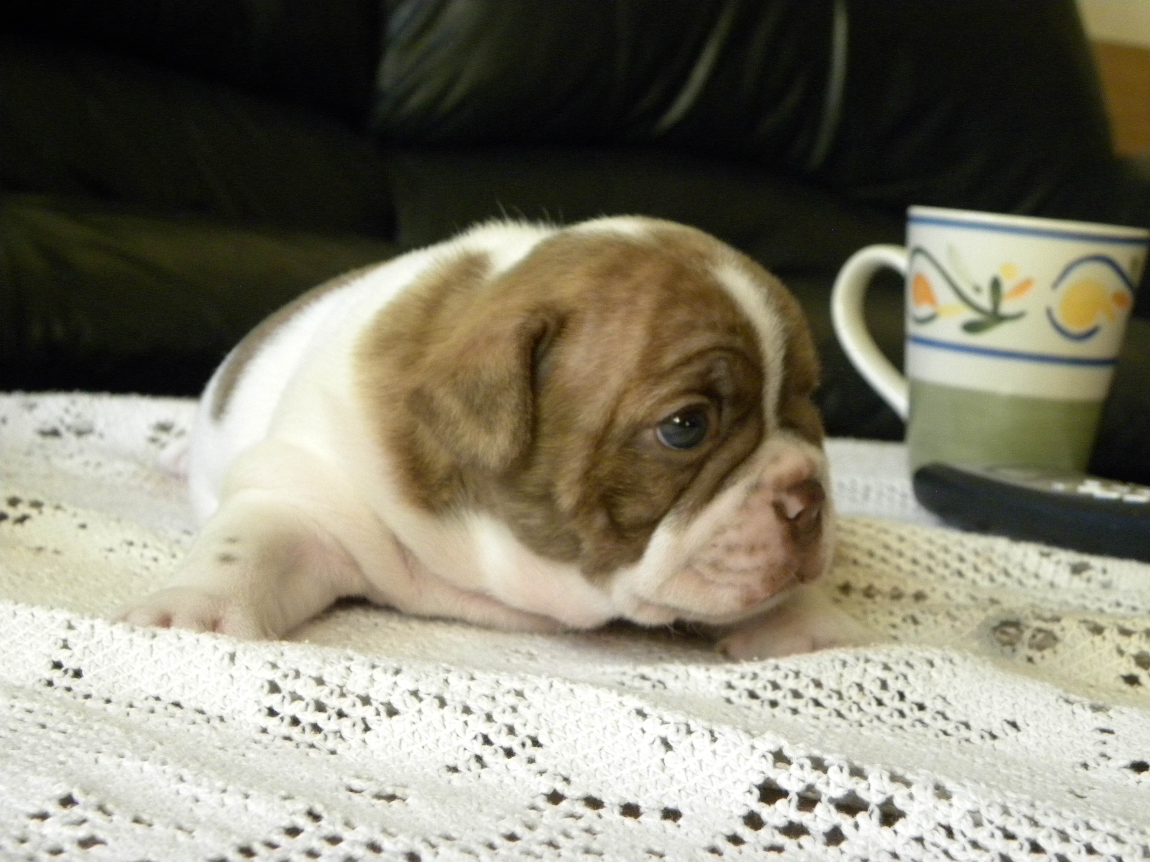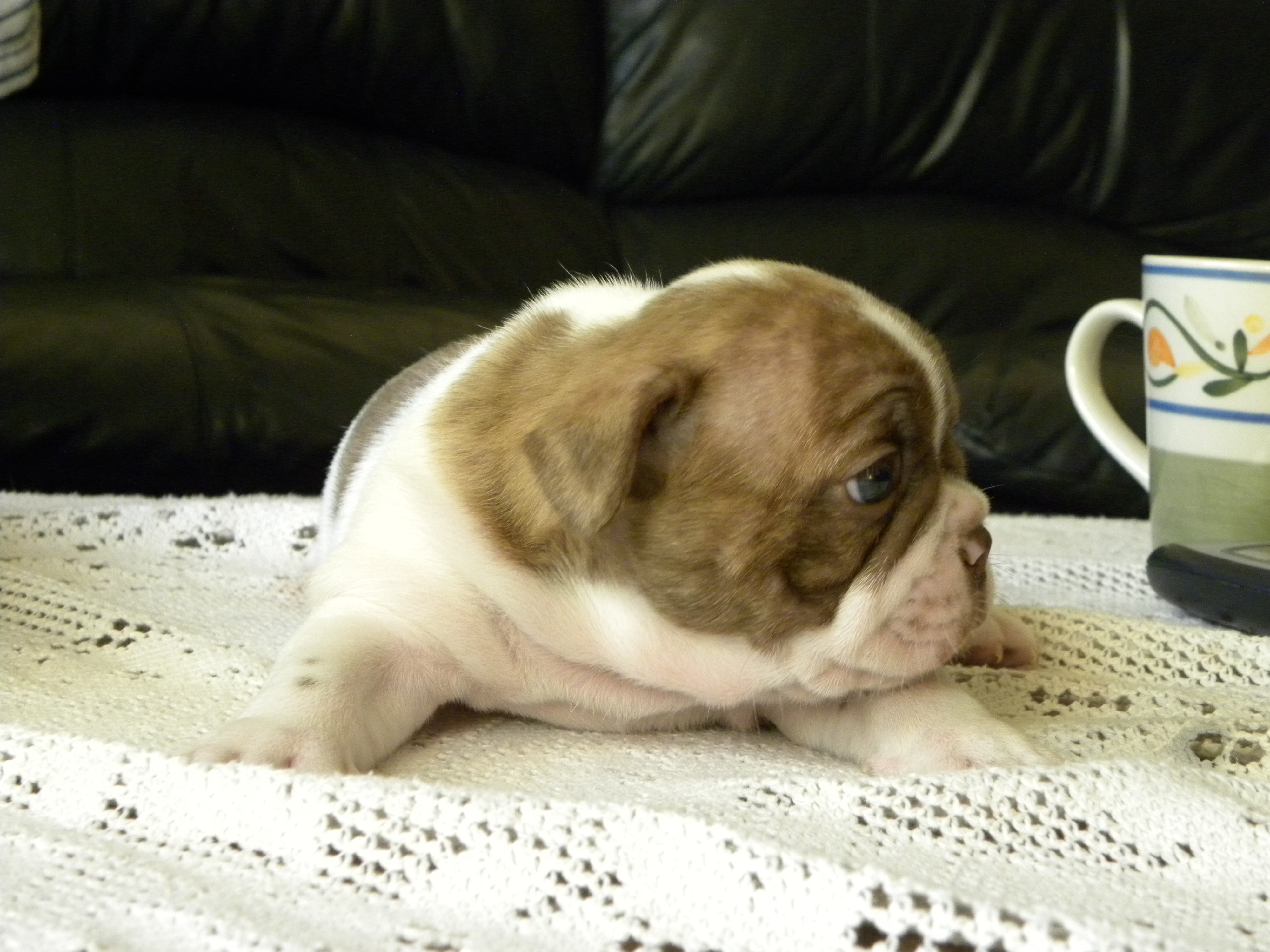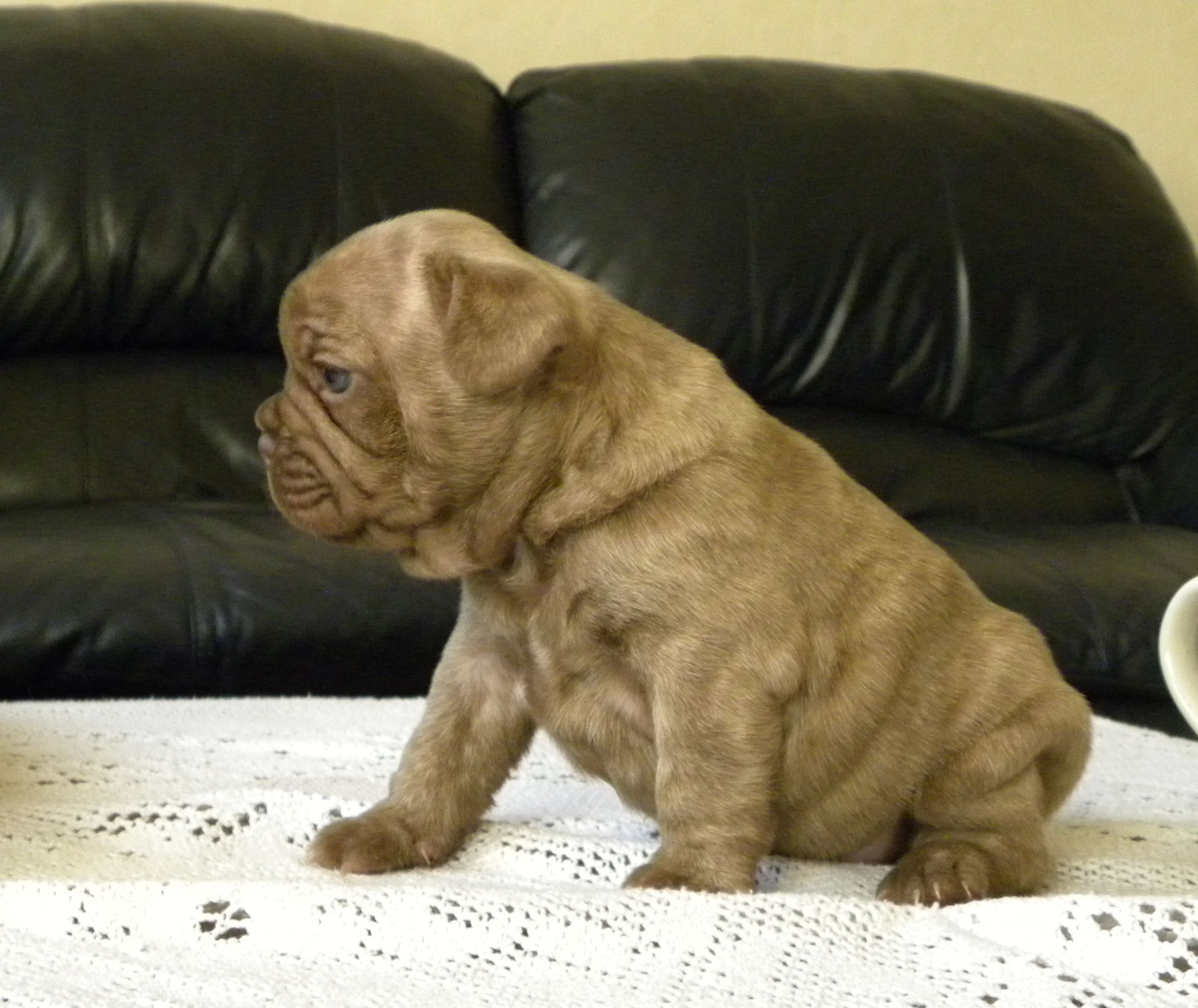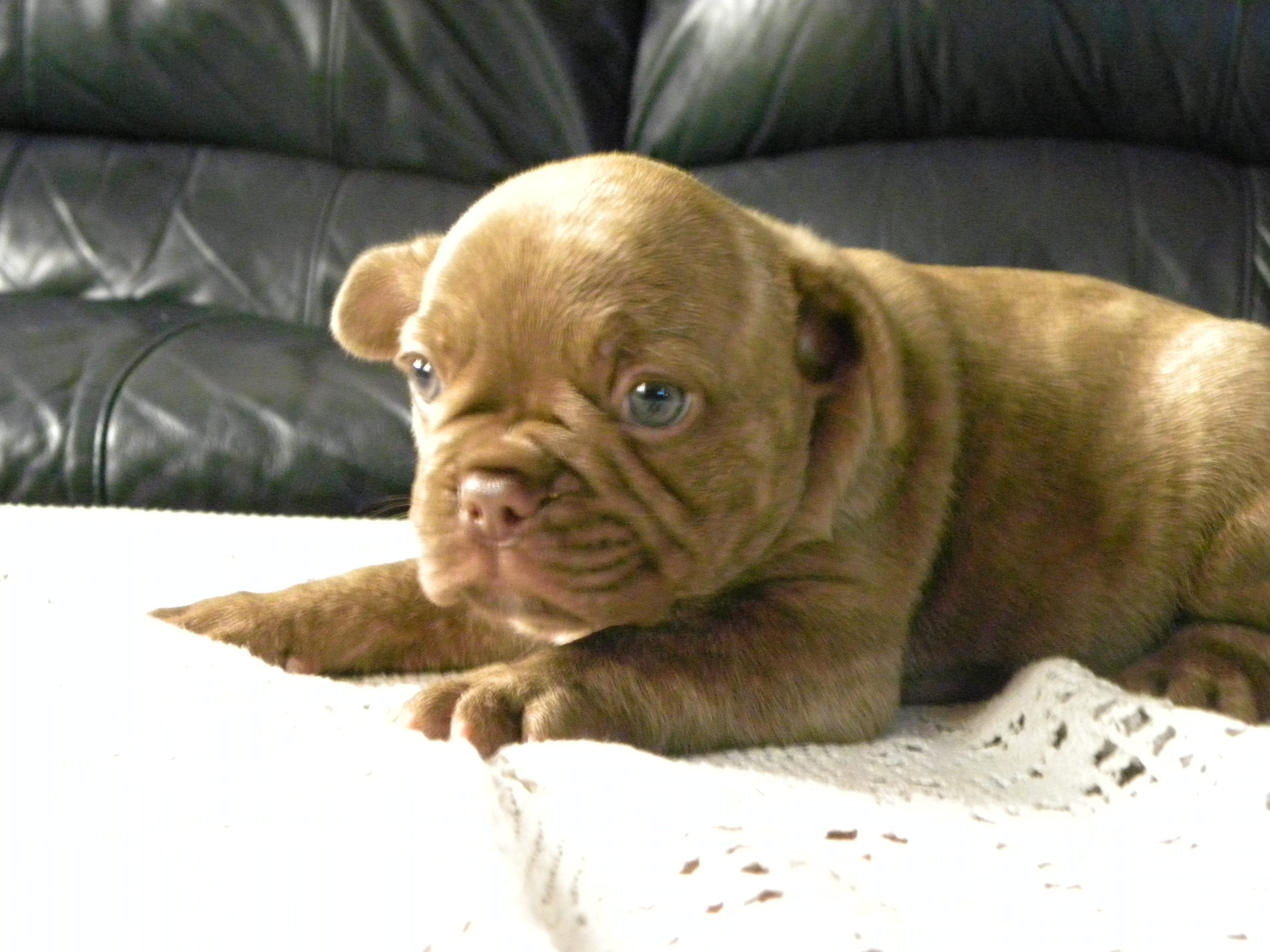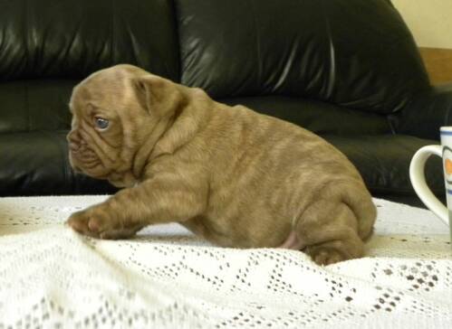 ~ This color is almost never seen in the frenchbulldog breed, do DNA testing is available to determine this color at this time. The dark normal chocolates are more commonly seen. We have both in our chocolate lines.