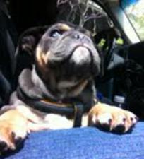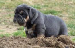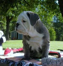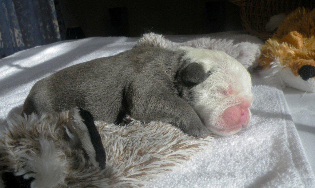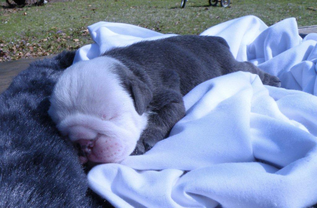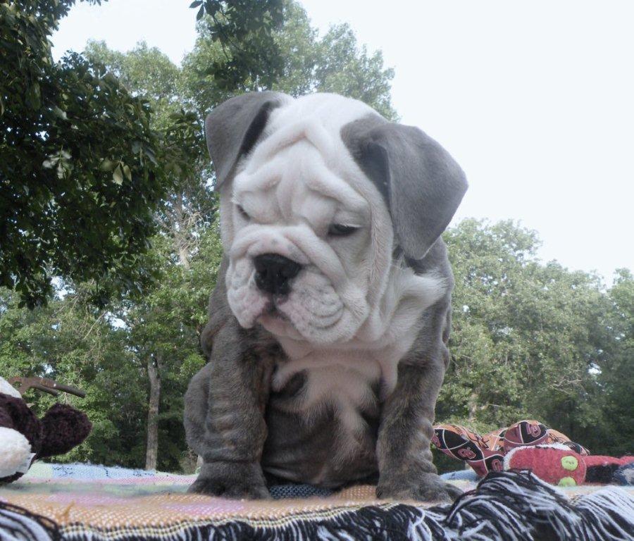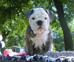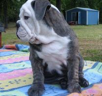 Our foundation male Blue "Que Psi", is a blue brindle and white and is a complete and total mush. He loves belly rubs and is very laid back and gentle.